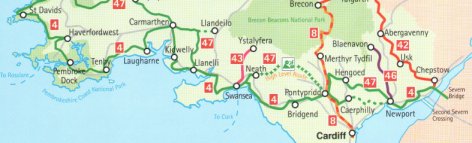 (Click on the map to get a larger image in a new window) To see the evelations click here The Taff Trail a 58 mile ride from Brecon to Cardiff (the orange coloured route 'number 8' on the map shown above) was completed 17th April 04 (click here for more details). This was the ‘warm up’ to the main event - the 250 miles Celtic Trail which runs from St Davids (Wales most westerly point) to Chesptow in the east. The Celtic Trail was completed over 3½ days (June 9th - 12th). We took the route along the coast - shown in green 'number 4' on the map above. The Mid Life Cyclists comprise Mark Broughton (chief advocate and leader), Kevin Bounds, David Cornwell, Rob Duckham, Jon Hancock and Robert Thomas. Average age 48!